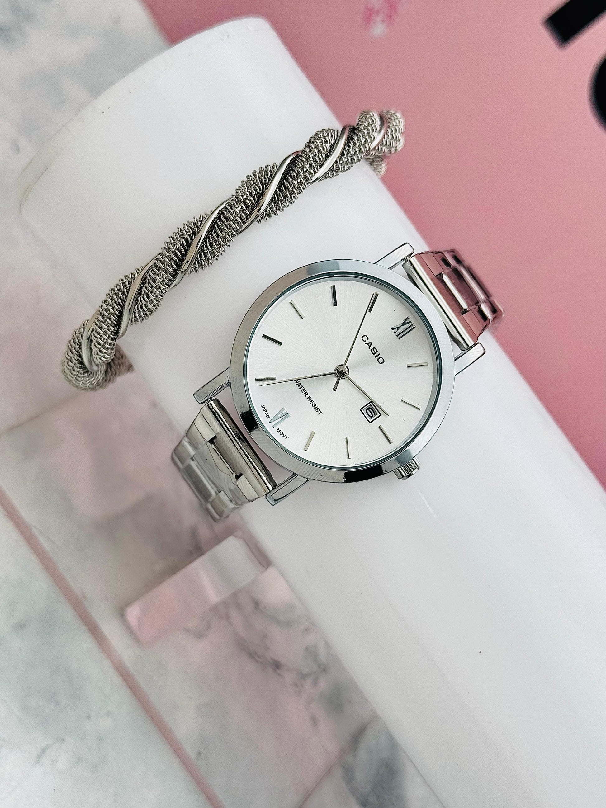 Descubre la elegancia en su forma más pura con este Casio de dama tipo Réplica AA, inspirado en el diseño clásico y minimalista de la marca. Su carátula blanca limpia, marcadores finos y acabado metálico crean una pieza versátil, moderna y sutilmente sofisticada.